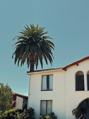 A hearty palm on a street I used to know. July 2024, Los Angeles, CA. | palm tree, coastal living, urban scene, white house, 1920s home, sunny day, blue sky, sun drenched, warm tones, California wall art