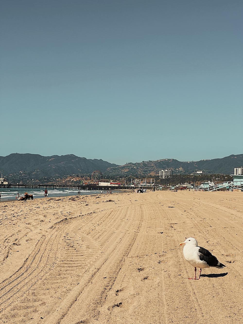 Bird in paradise. October 2024, Santa Monica, CA. | bird, seagull, sand, beach, west coast, coastal living, sunny day, sun drenched, warm tones, Los Angeles, California wall art